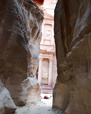Then suddenly through a narrow cleft in the rock we see the entrance to the city with the massive Treasury building carved deep into the sandstone rock face, with a reddish-pink glow. Luckily it has been protected from the wind and rain, as it still in pretty good shape.